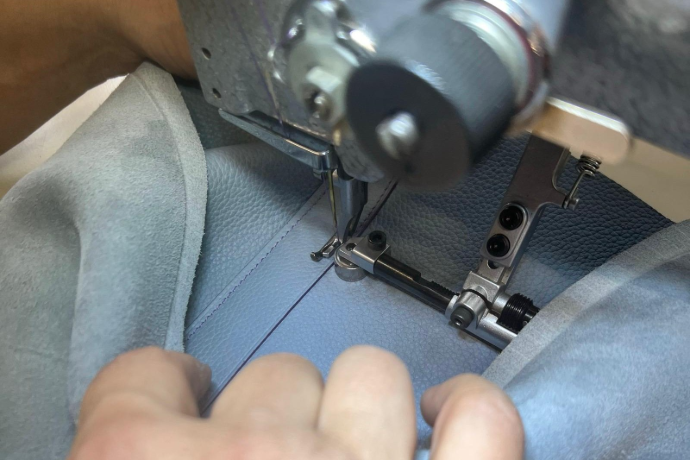 L’assemblage des différents éléments du sac à l’aide de colles contact à base aqueuse, appliquées avec précision pour assurer solidité et durabilité.