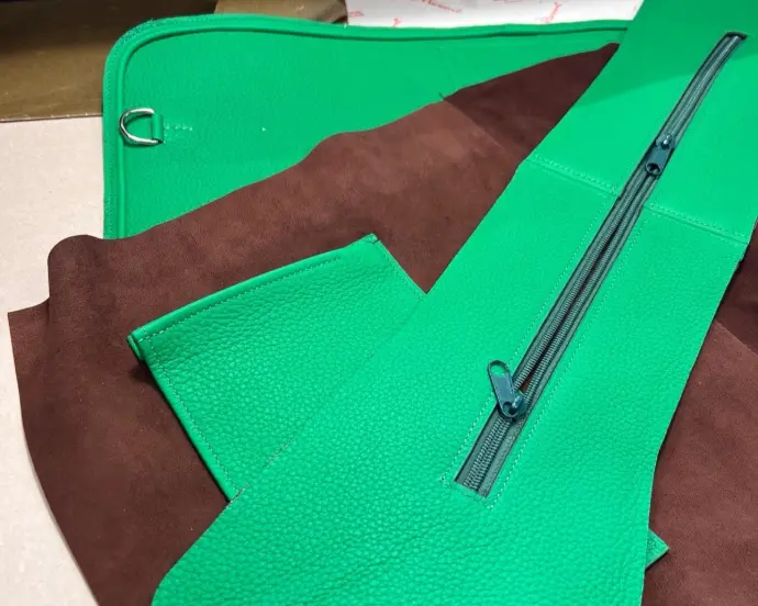 Au fil des étapes, vous créerez des poches intérieures en cuir (montées avec rembord et soufflet), monterez une fermeture à glissière sur bandeau et façonnerez des poignées sellier fixées artisanalement. Une bandoulière viendra compléter le modèle pour un porté plus polyvalent.